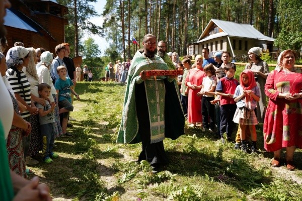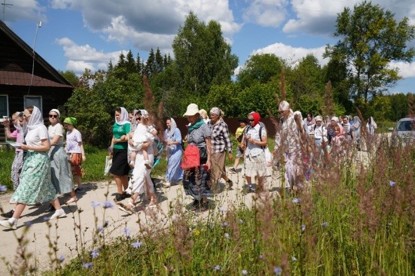 После Божественной литургии прихожане стали участниками крестного хода с иконой царя-страстотерпца Николая. Дети с родителями, горожане шли от села Кучки до часовни в честь святых Царственных страстотерпцев на территории семейного поселения на озере Чокоер. Молебен с акафистом Царственным страстотерпцам возглавил митрополит Йошкар-Олинский и Марийский Иоанн.