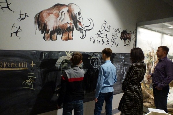 Первой задумкой стала «Наскальная живопись». Конечно, участникам этого действа не пришлось вооружаться тяжелыми рубилами и высекать пиктограммы на каменной стене. Им предоставили куда более современные и удобные предметы — большую черную доску и специальные мелки.