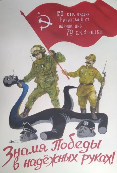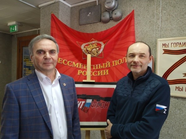 А выставка в прошлом году все-таки состоялась благодаря прямой поддержке Главы республики Юрия Зайцева. Увы, с тех пор многие художники меньше стали писать. Но Санников продолжил свой путь. Его произведения начали тиражироваться на сайтах, к примеру, телеведущего Владимира Соловьева, «Армия. Оружие. Россия», в том числе расходятся по разным странам.Без сомнения, художник не мог остаться в одиночестве, ведь когда идешь к цели, обязательно будут попутчики. Так, в конце прошлого года на одном из мероприятий Андрей Санников оказался в соседнем кресле с руководителем регионального отделения Общероссийского общественного гражданско-патриотического движения «Бессмертный полк России», подполковником запаса, журналистом Виталием Лежаниным. Общего было много. Плакаты Санникова, посвященные СВО, напрямую или косвенно часто связаны и с историей Великой Отечественной войны. К примеру, одним рисунком точно показана эта связь: участник Великой Отечественной войны передает знамя Победы бойцу СВО, который душит нацистскую гидру. Мысль проста – россияне взяли эстафету и закончат дело отцов и дедов.