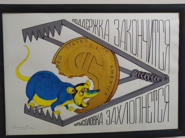 Также на выставке немало политической карикатуры на злобу дня. Своим индивидуальным сатирическим почерком автор уничтожает всех врагов России. И еще одним из достижений содружества с движением «Бессмертный полк России» можно назвать создание студии «Агитфронт», пока единственной в стране. Есть надежда, что эта студия привлечет молодых художников к возрождению жанра плаката. На выставке можно увидеть и нарисованный символ студии: автомат, в магазине которого вместо пуль - карандаши с российским триколором. Карандаш может разить врага не хуже пули!