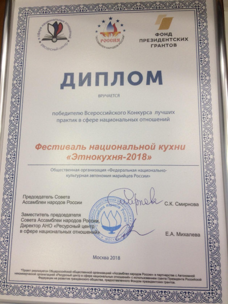 О победе проекта «Фестиваль национальной кухни «Этнокухня -2018» стал победителем Всероссийского конкурса лучших практик в сфере национальных отношений сообщила на свой личной странице в соцсети директор Республиканского центра марийской культуры Наталья Пушкина.