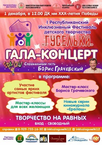 На гала-концерте I республиканского инклюзивного фестиваля детского творчества «Гусельки», который состоится в субботу, 1 декабря, за титул «Гран-При Фестиваля» поборются 40 лучших детских коллективов и юных исполнителей со всей республики, рассказали нам в пресс-службе Минсоцразвития Марий Эл.