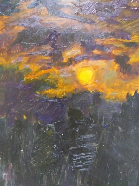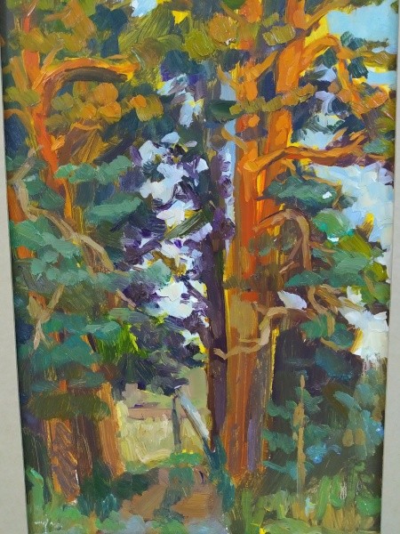 Не знаю, угадала или нет. Практически законченными произведениями можно назвать лишь работы самих педагогов, у студентов 2 и 3 курса – это еще этюды. Но они показали, что умеют быстро схватить убегающую натуру, при этом все в порядке с передачей перспективы, в отражении света-тени. К примеру, на отлично уловила полуденные тени в своей сложной по исполнению картине «Полдень в сосновой роще» Алина Ибураева, основы русской академической школы живописи замечательно воплощены Максимом Москвиным в картине «Со стороны огорода», Татьяной Матвеевой – «Храм в ожидании». Казалось бы, ничего особенного нет в этюде Дарьи Молчановой «Солнце в храме». В храме был пожар, сейчас он восстанавливается – в работе художника видна даже свежая штукатурка. Здесь, главное, ощущаешь присутствие чего-то большего. Наверное, это связано с врывающимися в пустое помещение лучами яркого света. По сути, картины еще нет, но идея исполнена. Неожиданно поразили работы студентки 2 курса Анастасии Шаргиной «Солнце на закате», «Янтарные сосны». От них невозможно глаз оторвать! Ее закат огненно раскален, одновременно тревожный и светоутверждающий. У подростка уже видны свой стиль и попытка вырваться из «академии».