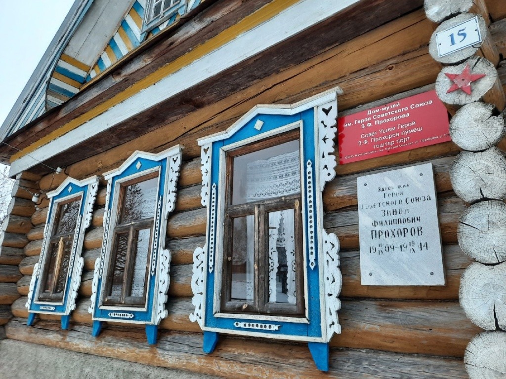 Дом постройки начала ХХ века. На стене возле окна мемориальная доска и табличка с надписью на марийском и русском языках – «Дом-музей им. Героя Советского Союза З.Ф. Прохорова». Здесь он жил, сюда не вернулся с фронта Великой Отечественно войны.