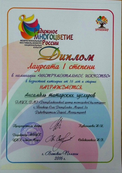 Ансамбль татарских гусляров при Республиканском центре татарской культуры в Марий Эл (руководитель - заслуженный работник культуры Республики Марий Эл Гарай Габдрахманович Магсумьянов) стал лауреатом Межрегионального фестиваля-конкурса национальных культур «Радужное многоцветие России». Конкурс прошел с 4 по 6 ноября в городе Вятские Поляны Кировской области, сообщила пресс-служба Минкультуры Марий Эл.