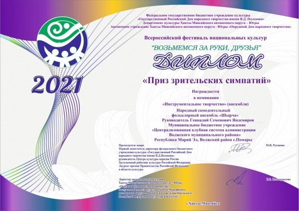 Почетный приз народной любви достался фольклорному ансамблю "Шырча"  под руководством Геннадия Яндемирова. Коллектив из Волжского района был отмечен в номинации «Инструментальное творчество» (ансамбли) и получил Приз зрительских симпатий.
