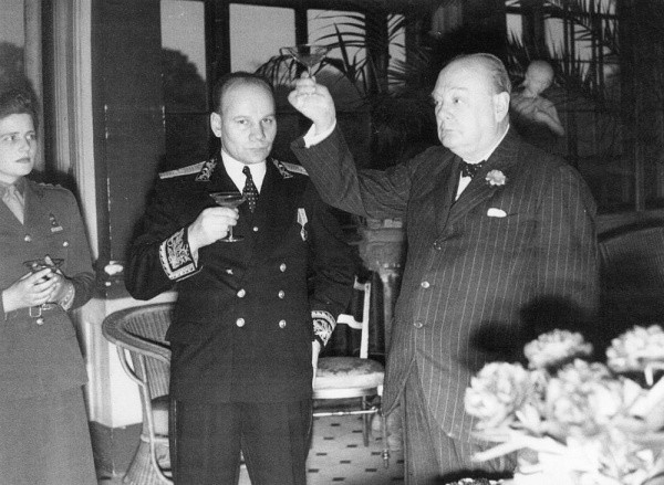 Сохранились фотографии. Обратите внимание: несмотря на всеобщую радость, британский лидер насуплен да и Гусев неулыбчив. В чем причина? Да, уже тогда появились первые признаки "холодной войны" и Черчилль не исключал вооруженного конфликта с СССР. Но подтекст глубже.