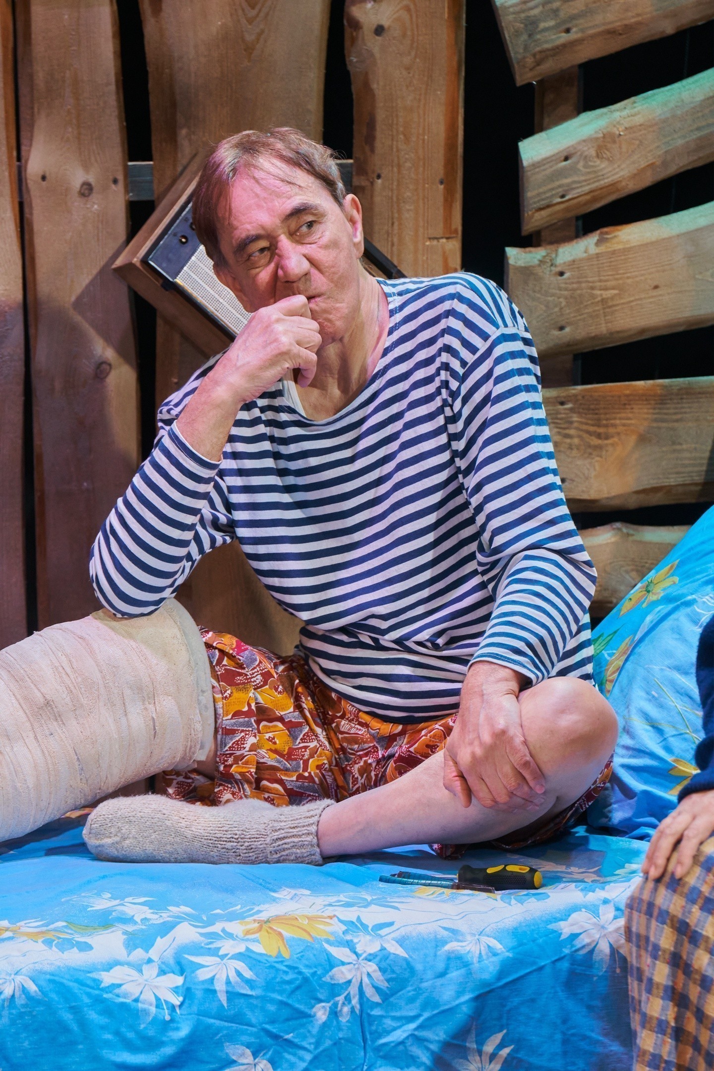Заслуженному артисту РМЭ Дамиру Закирову в спектакле пришлось решать не совсем простую актерскую задачу: его герой все действо лежит на кровати со сломанной ногой. Актеру удалось создать с помощью мимики, голоса, жестов, пластики, взгляда образ взрослого деревенского мужика, которому очень не хватает внимания близких. Это было натурально, смешно и очень трогательно! Яркая и органичная игра Екатерины Шишмаковой (Таня) и Игоря Новоселова (Михаил) дополнила великолепный ансамбль героев, а для молодого, только начинающего актера Даниила Желудкова «Семейный портрет с посторонним» и роль этого самого «постороннего» Виктора стала первой серьезной работой в театре. Первый блин получился не комом, но, безусловно, ему есть куда расти и есть над чем работать.
