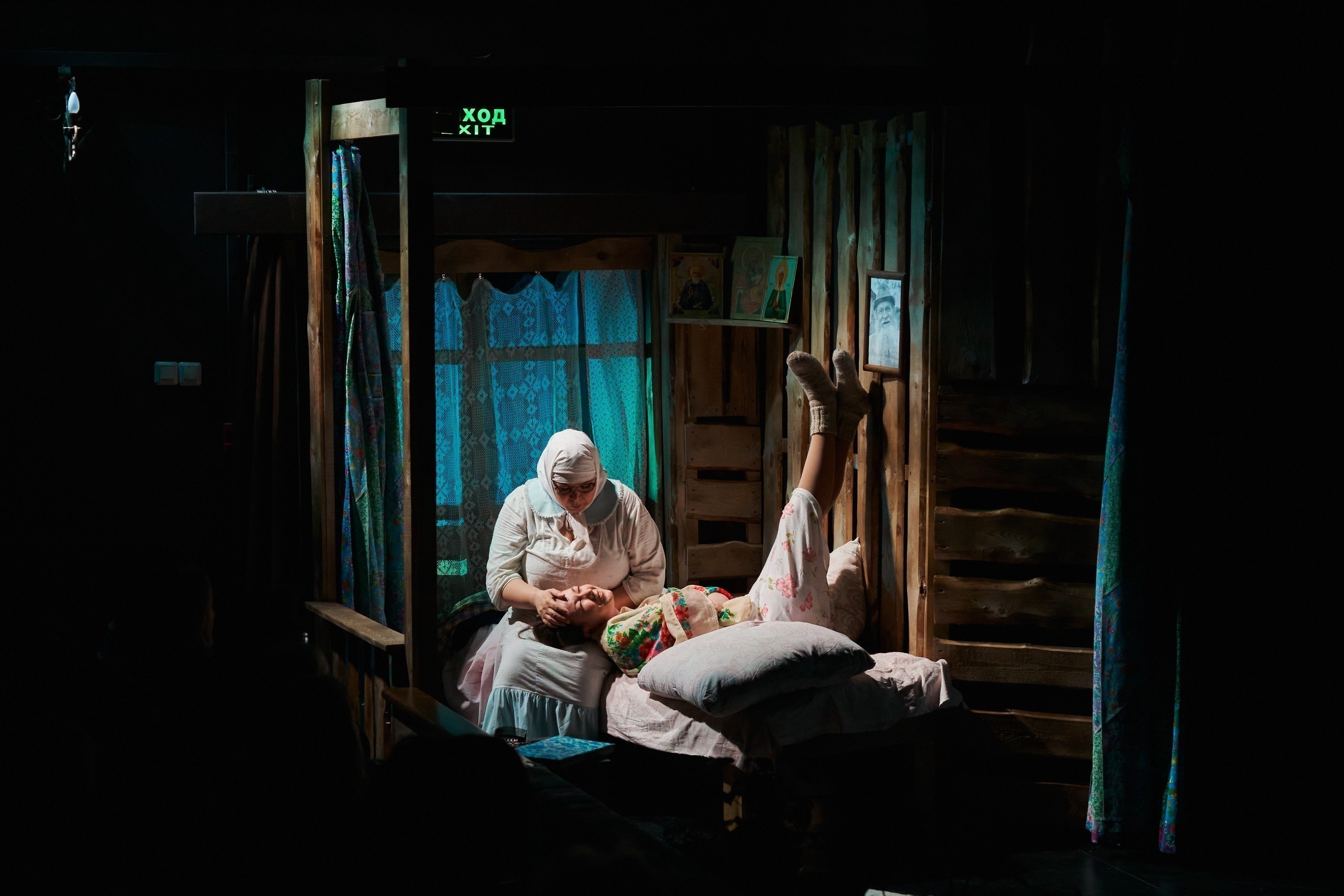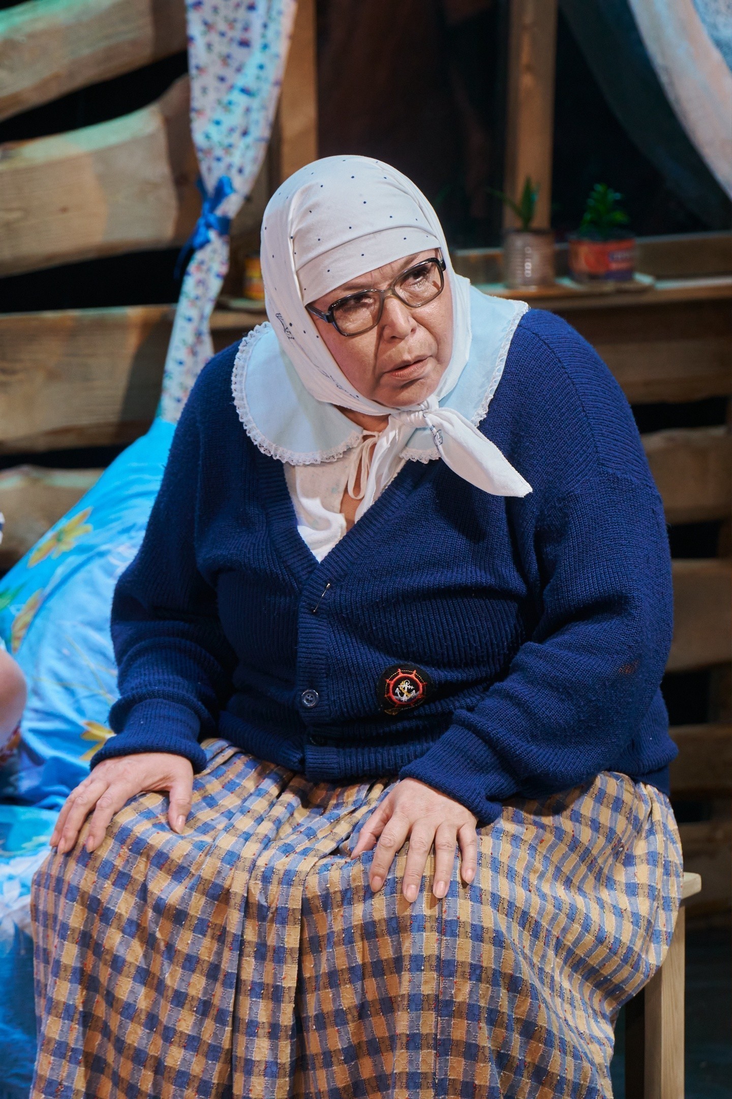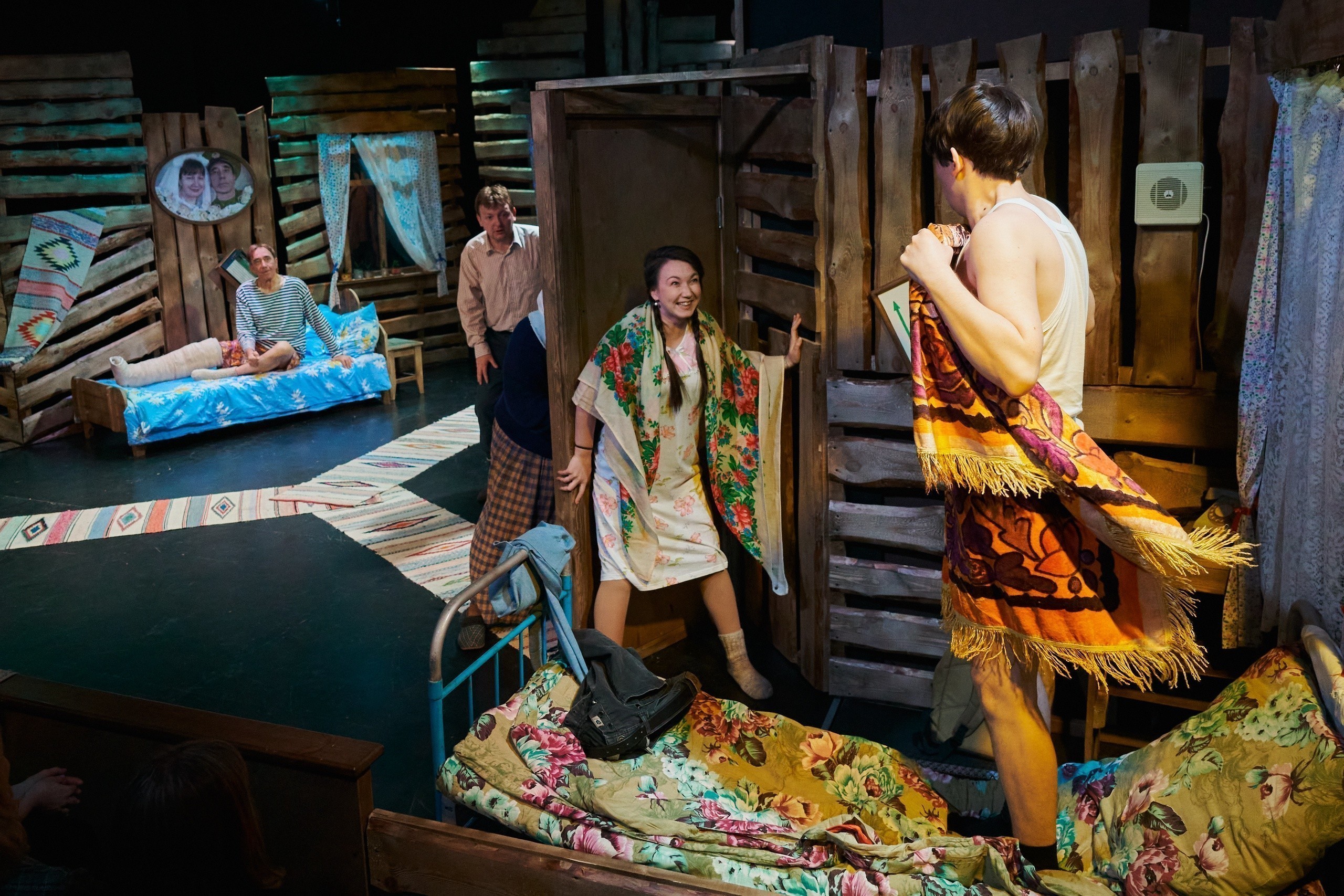 Еще до начала спектакля зрители погружаются в атмосферу деревенского дома конца 80-х годов прошлого века. Звуки программы радиостанции «Маяк» того времени, разливающиеся в пространстве, живые цветы в горшках, стоящие на авансцене, настоящие, деревенские коврики… Все это удивительным образом как будто обволакивает тебя и мгновенно настраивает на нужную тональность будущего действа. «Семейный портрет с посторонним» идет на малой сцене театра, и в этом его огромнейший плюс! Такие атмосферные спектакли просто обязаны проходить в тесном, порой даже физическом контакте со зрителями. Когда понимаешь, что можешь дотронуться до героя или героини просто протянув руку, когда кажется, что слышишь, как бьются их сердца, когда чувствуешь запах свежесваренной картошки, соленых огурцов и винегрета, то ощущаешь себя непосредственным участником всей разыгранной истории! Не скрою, что даже мне, театралу со стажем, несколько раз хотелось помочь, поддержать, протянуть руку Бабке (заслуженная артистка Калмыкии Людмила Мансурова) или поправить постель Тане (арт. Екатерина Шишмакова). Актерский состав в этой постановке сложился, на мой взгляд, просто великолепно! Каждый образ – это характер. Это личные истории, из которых многое хотя и остается «за кадром», но благодаря замечательной актерской игре быстро «считываются», и ничего додумывать не приходится. Ощущение, что ты все про прошлую жизнь этих людей знаешь, появляется как-то само собой.