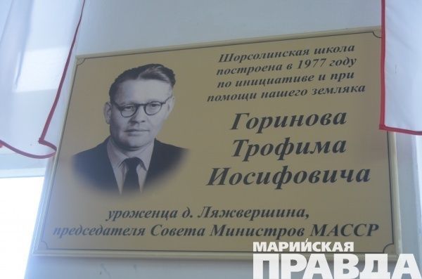 В Шорсолинской средней школе Куженерского района Марий Эл открыли памятную доску, посвященную Трофиму Горинову, возглавлявшему в течение 12 лет совет министров МАССР. Недавно исполнилось 90 лет со дня его рождения.
