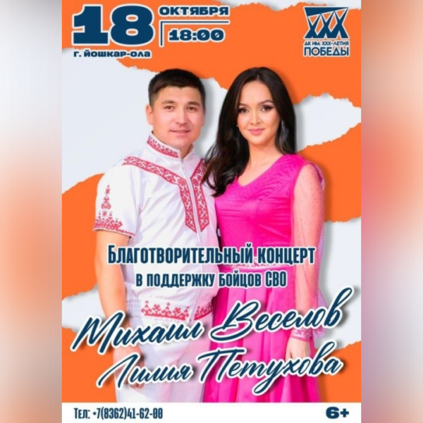 18 октября на сцене Дворца культуры им. ХХХ-летия Победы выступят звёзды марийской эстрады Михаил Веселов и Лилия Петухова (6+). Полученные средства будут направлены для помощи бойцам СВО.