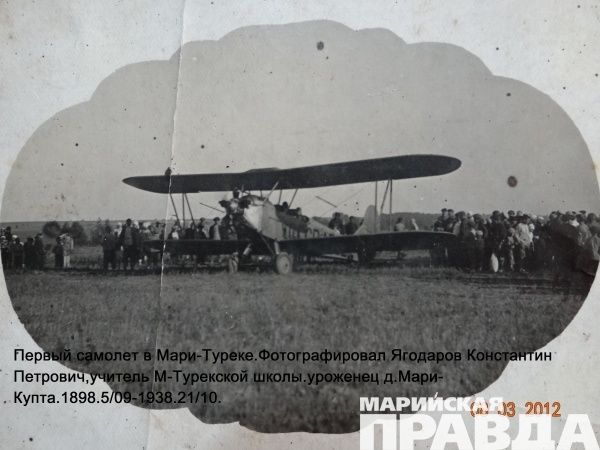 Еще одной диковинкой того времени был фотоаппарат на треноге, который имелся у Константина Ягодарова. Фотографию наш герой очень любил, особенно нравилось ему снимать деревенских жителей и, конечно, своих учеников. Именно он автор снимка первого самолета, который прилетел в район в начале ХХ века.