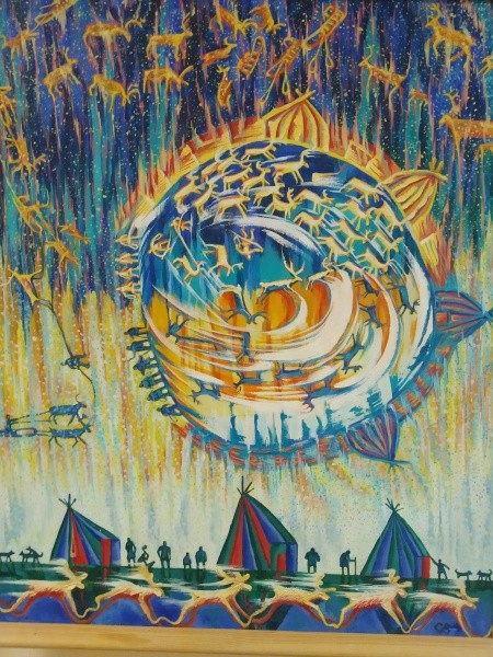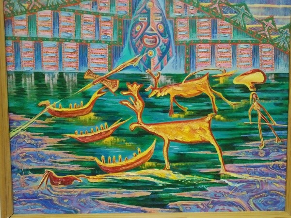 Ну, а по закону справедливости, часть из них все-таки нужно у автора выкупить. Что они из себя представляют? На выставке есть работы, написанные в академическом стиле. Но небывалый наплыв художников 20 августа на презентацию объясняется интересом именно к его этнофутуристическим картинам.