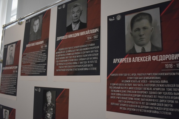 На выставке можно узнать о жизни таких знаменитых личностей, как пионервожатая Ольга Тихомирова, ушедшая на фронт добровольцем, Георгий Терехов, участвовавший в обороне Сталинграда и бывший учитель русского языка, учитель физики, математики и рисования Михаил Шипов, прошедший с боями от Украины до Чехословакии, учитель истории Герасим Ямбаршев – участник боев за Ленинград и многие другие.