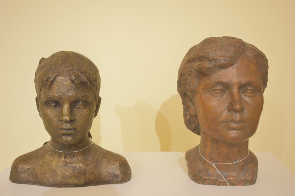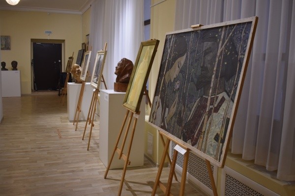 Всего представлено около 40 экспонатов: вот мариечка в цветочном венке грустит на лугу, напоминая о васнецовской «Аленушке», вот яркий портрет женщины, внешне схожий с Мариной Цветаевой − внимательный посетитель может не только рассмотреть детально работы, но и задать интересующие вопросы экскурсоводу. Например, многих впечатлит скульптурная композиция «Мать» − она находится прямо в центре зала. Ее автором является известный мастер резьбы по дереву и гипсу, чеканке по алюминию и меди Анатолий Козьмин. Чем примечательна его работа? По словам Марии Бушила, это пример лиризма, соединяющий в себе обобщенные формы и женские нежность и обаяние. Марийский колорит узнаваем благодаря традиционному головному убору и украшению из монет.