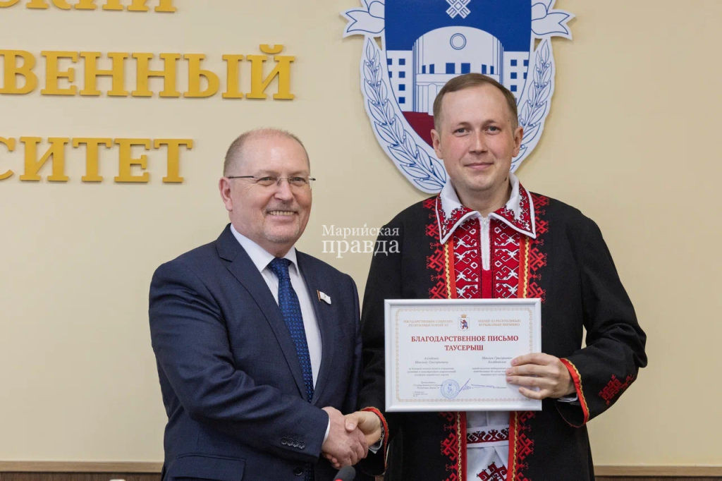 Частью торжественной церемонии открытия мероприятия стало вручение благодарственных писем Госсобрания республики: за вклад в развитие национальной культуры их получили заведующий отделом национальных культур Республиканского научно-методического центра народного творчества Максим Алгайкин и методист Республиканского центра марийской культуры Сергей Карпов.