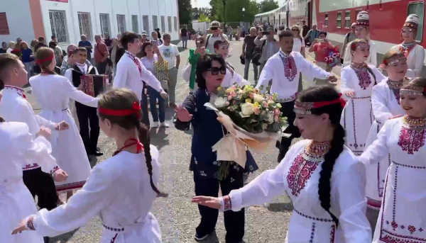 Прибывшие сразу погрузились в культуру марийского края – на перроне они увидели народный марийский танец коллектива «Жар-птица» колледжа культуры и искусств имени И.С. Палантая.