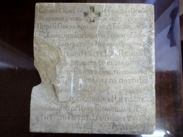 Это закладной камень здешнего храма святых апостолов Петра и Павла. Артефакт чудом уцелел и в 1979 году был найден при разборе завалов сгоревшей церкви.
