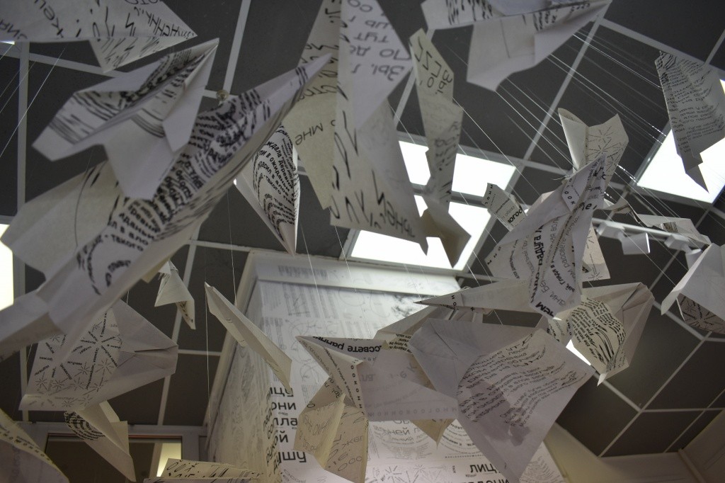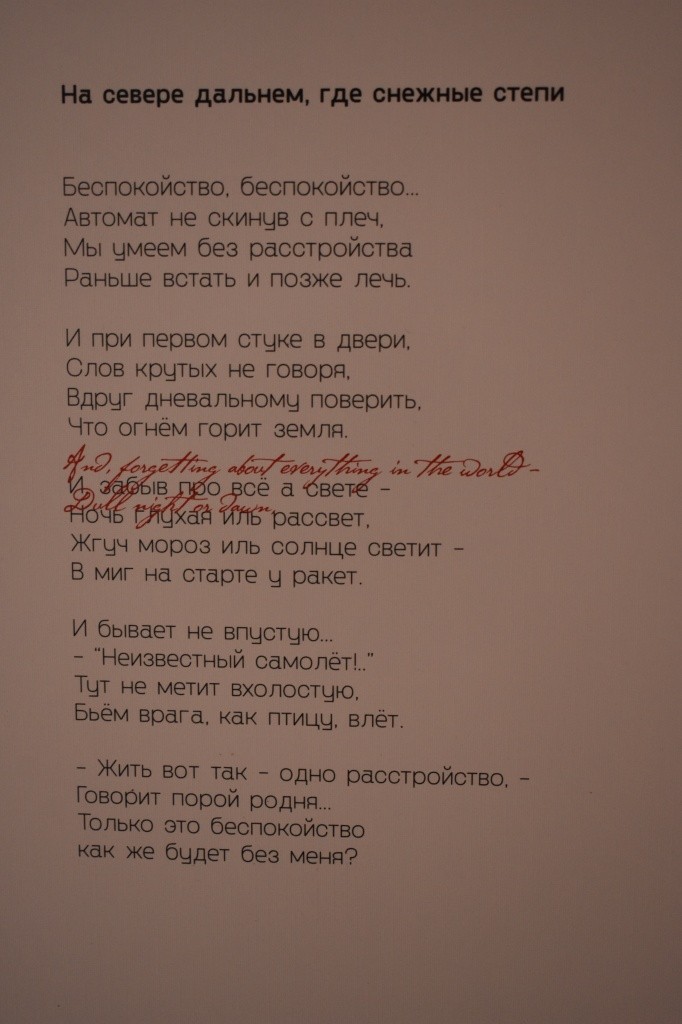 − Нам интересно посмотреть эту статистику, − признается Дарья. − Одна из стен КВЦ украшена 44 стихотворениями дедушки − почти полная коллекция его работ, которую можно почитать. Красным рукописным текстом отмечены те строки, которые вызывали у девчонок интерес при переводе на английский язык − для того, чтобы они могли с ними работать, их все пришлось перевести. Были метафоры, которые оставались безумно красивыми на обоих языках. Идея этого арт-объекта проста: каким бы языком ни владел человек, это не важно, главное − смысл. Мы пытались воссоздать атмосферу стихотворения, передать чувства и эмоции, а заодно напомнить, что все должны жить в мире.
