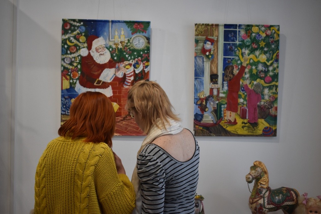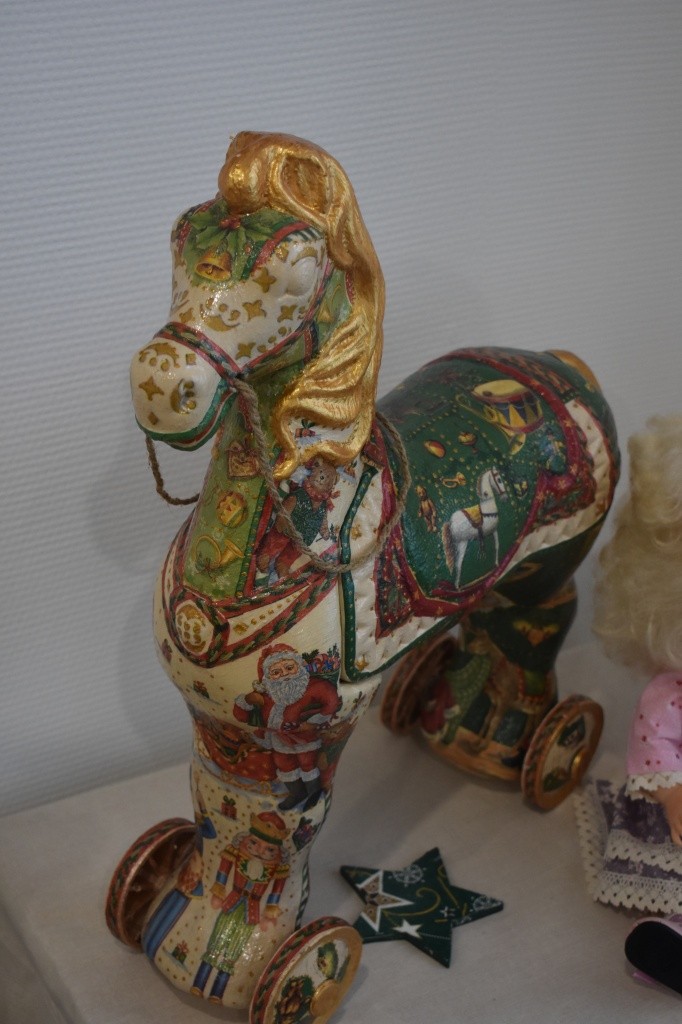 − Творчеством я занимаюсь в течение года. Пришла к этому совершенно неожиданно, начав с декупажа тарелочек, украшения посуды. Для этого поначалу использовала салфетки, потом у меня появилась специальная бумага. Затем пришел декопатч − поделки, выполненные на деревянной или стеклянной основе, сначала все это покрывается краской, наносится клей и рисовая бумага, снова клей, лак − и готово! В этом стиле самым масштабным творением стал олененок высотой в 80 сантиметров, который занял свое место в колонии. Его я сделала из обычных салфеток. На этой выставке есть моя любимица − лошадка, которую изначально хотели выбросить, но она получила новую жизнь. Глядя на нее, мне вспоминаются детские годы, и я решила, что она будет в новогоднем стиле. Новый год − это добрый, чистый праздник, много яркого, блестящего! Поэтому многие мои работы выполнены на эту тематику, − рассказала она первым посетителям выставки.