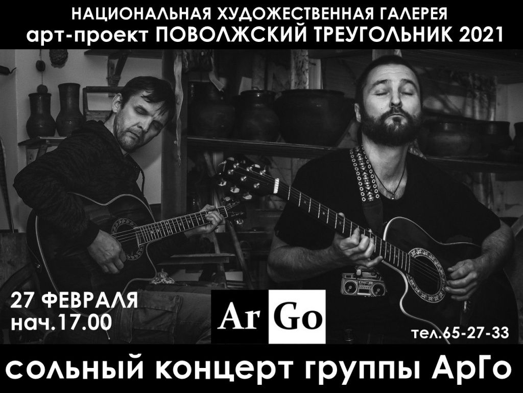 Вечером 27 февраля в Национальной художественной галерее можно будет не только полюбоваться работами именитых участников выставки, но и насладиться музыкой группы «АрГо», чей сольный концерт продолжает творческую миссию арт-проекта «Поволжский треугольник».