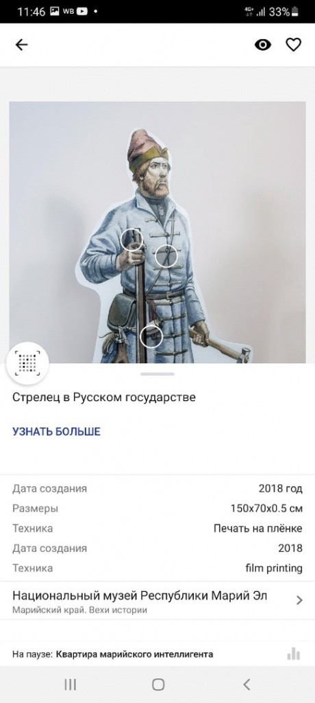 Такой гид даст интересные факты о выставке: просто наведите камеру мобильного телефона на экспонат (или QR-код), а затем нажмите на «точки интереса» для описания его деталей. Мультимедиа-формат проекта «Марийский край. Вехи истории» представлен 40 предметами с фактами о времени и месте создания, размерах экспоната и технике производства.