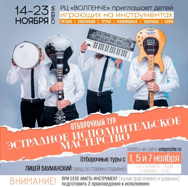 РЦ "Волгенче" набирает ребят, играющих на медных духовых (труба, тромбон, саксофон), клавишных (фортепиано, баян, аккордеон), ударных инструментах (барабаны, перкуссия) и, конечно, гитаристов (гитара, бас). Будут места и для вокалистов, но основное внимание будет уделено инструментальному творчеству. Обучение пройдет в кампусе РЦ «Волгенче», расположенном на территории детского лагеря «Лесная сказка», с 14 по 23 ноября.