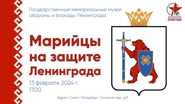 Вечер «Марийцы на защите Ленинграда» пройдет с литературно-музыкальным сопровождением Марийской Национально-культурной автономии Ленинградской обрасти «Ший корно». Гости увидят книжно-иллюстративную выставку из фондов Государственного архива Марий Эл и этнографическую выставку «Душа Марий Эл».