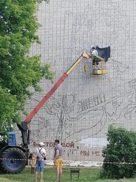 К работе приступили вечером 24 июня, когда уже наступили сумерки: специально ждали захода солнца, чтобы с помощью проектора перенести контуры граффити на стену дома. На следующий день творческий процесс сопровождался популярными хитами группы «Кино».