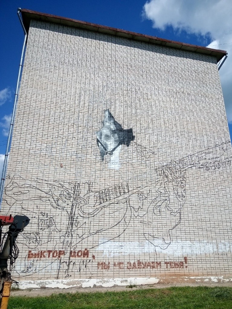 Наверное, не будет ошибкой, если сказать, что история создания этого граффити уходит в август 1990 года – день, когда после известия о трагической гибели рок-музыканта на стене сернурской пятиэтажки появилась надпись: «Виктор Цой, мы не забудем тебя». За многие годы поселковая молодежь на этой же стене дома не раз пыталась проявить свои художественные «таланты», которые выглядели скорее, как вандализм. Но слова, посвященные Цою, никто никогда не трогал. В 2020 году сернурские активисты решили обновить надпись. Тогда-то им и пришла идея сделать большое граффити.