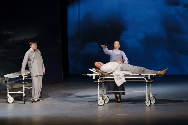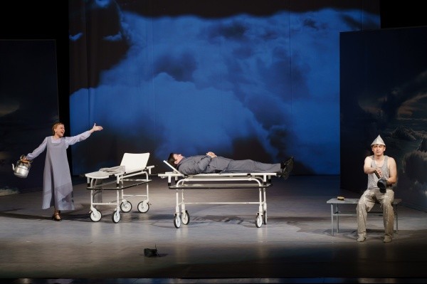 Персонажи спектакля – люди из разных социальных слоев и даже разных столетий! Они уже не живут, но еще «играют в жизнь», поэтому и кипяток, и сахар в ней – только воображаемые. У каждого – своя история, свои причины попадания в этот жуткий «накопитель», где нет мебели, кроме больничных каталок, тусклые одежды и грубая обувь. Вокруг фотопанели со свинцовыми облаками, да еще едущий по кругу и без перерыва пустой черный трамвай… Сценография решена таким образом, что актеру абсолютно не за что спрятаться, «помощников» в виде реквизита или роскошных костюмов – нет. Есть только огромное желание вспомнить Тот Самый Главный Грех и покинуть этот «концлагерь» с вечными надзирателями-самоубийцами, продолжить свой загробный путь уже на другом уровне, стать «богаче», как часто повторяет крепостная девушка Лиза (арт. Наталья Ложкина). Другой персонаж, Семен Кушкин, блистательно сыгранный артистом Дмитрием Воронцовым, говорит, что ад - это не там, где в котле варят, страшнее в себе вариться, страшнее звоночек не услышать… Пожалуй, эти слова – одни из самых важных в спектакле.