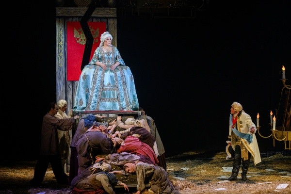 Не перестану повторять, что в «Царской охоте» поразительно все. Хотелось рассмотреть каждую деталь декораций, не пропустить каждое движение. Но больше всего, безусловно, «досталось» актерам. Титаническую работу над собой проделали многие из них. Некоторые режиссерские находки заставляли сердце замирать, видя почти акробатические трюки основных персонажей. Получила огромное удовольствие от игры всего актерского состава. Всё в точку. Все к месту. Отдельное спасибо Сергею Матюшкину за «пиита» Кустова и Надежде Белобородовой за Екатерину Дашкову. Но три главных героя этой трагической истории, Екатерина II (заслуженная артистка Калмыкии Людмила Мансурова), граф Алексей Орлов (артист Дамир Сафиуллин) и княжна Елизавета (артистка Юлия Ангеловская) как неравные стороны «треугольника судьбы», несли на себе основную смысловую и эмоциональную нагрузку. Когда ком в горле появлялся, и слезы готовы были предательски брызнуть из глаз, сомнений не возникало: ноша, ох, как нелегка.