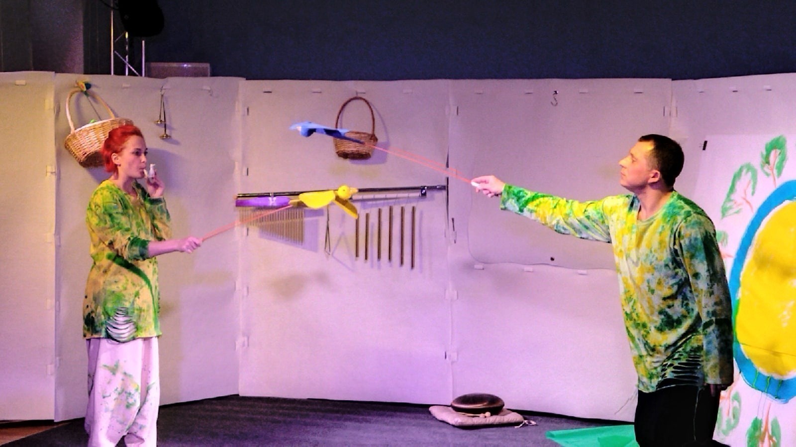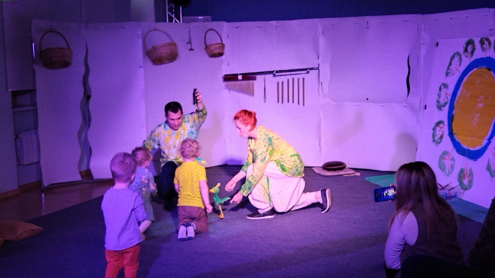 Театр, как известно, начинается с вешалки. А в бэби-театре этот фразеологизм становится неукоснительным правилом: и взрослые, и детки перед входом в зал должны переодеть обувь или просто снять ее. Еще устроители рекомендуют родителям брать с собой запасную одежду для своих малышей, если они испачкаются красками или обольются водой. Да! Такое случается! Потому что детям здесь позволительно все! Можно ходить, бегать, ползать, валяться «на одуванчиках», устраивать из них фейерверк, рисовать красками, прикасаться к волшебным птичкам, играть на необычных инструментах, таких как глюкофон и колокольчик, словом, становиться самыми главными героями истории про самое волшебное время года – весну.