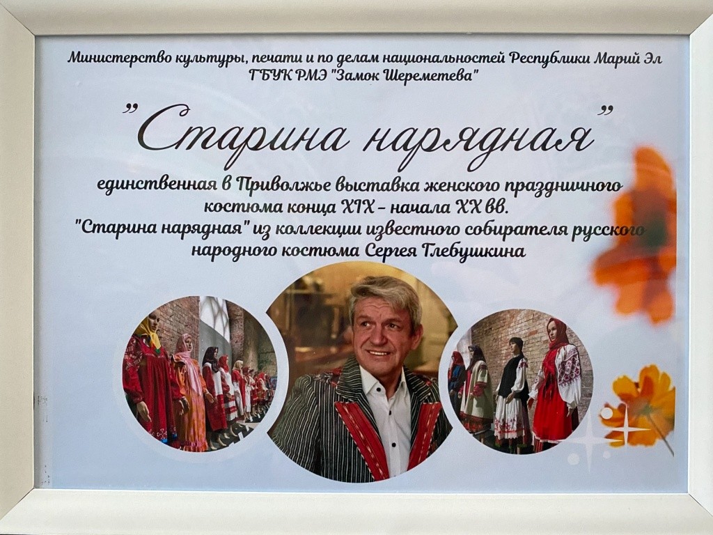 15 и 16 сентября, когда в Йошкар-Оле проходил VIII Всероссийский фестиваль народного и сценического искусства «Танцуй и пой, моя Россия!», в фойе Марийского театра оперы и балета имени Э. Сапаева состоялась выставка традиционного русского костюма из коллекции Сергея Глебушкина и национального костюма народов Поволжья «Старина нарядная и вековые узоры».