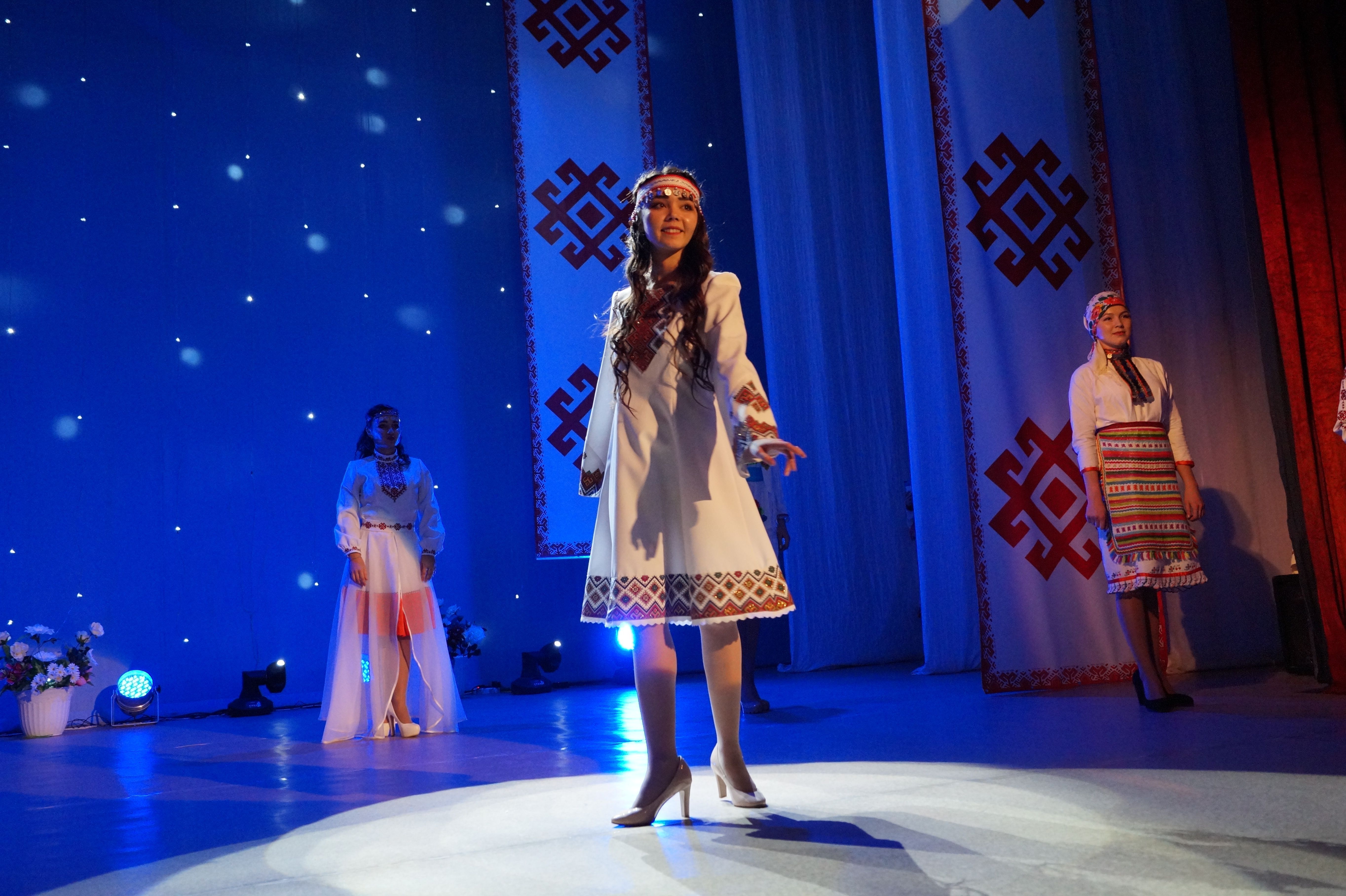 Участницы – Анжела Филиппова, Карина Ямбарцева, Вероника Мустаева, Мария Милютина, Ирина Зорина – представили видео-визитки, рассказав о себе и своей семье, после чего дефилировали в марийских свадебных нарядах, отвечали на вопросы ведущих – семейной четы Алины Егошиной и Александра Бирюкова.