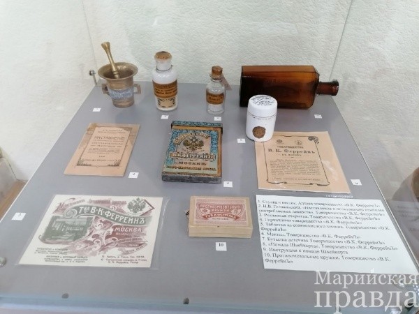 Большинство экспонатов выставки – это предметы из аптек Москвы, Санкт-Петербурга и Казани. Предметы с атрибутикой Царевококшайской аптеки экскурсоводы и владелец коллекции называют большой редкостью.