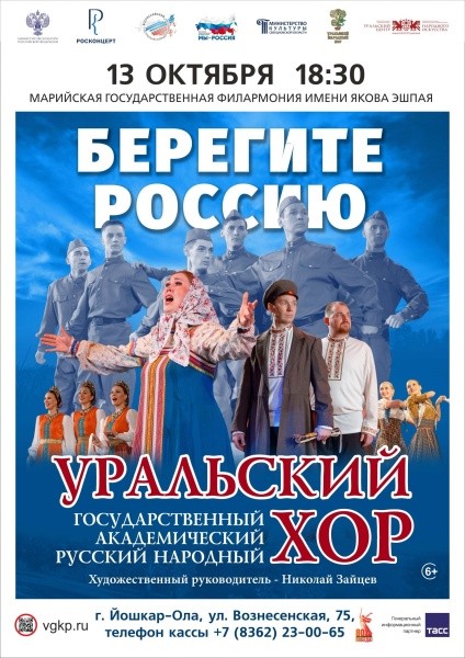 Жителей Марий Эл приглашают в Марийскую государственную филармонию им. Я.Эшпая на концерт Уральского государственного академического русского народного хора в 18:30. В репертуаре артистов ‒ зажигательные танцы и народные песни, в том числе те, что поднимали дух в годы войны. Программа получила название «Берегите Россию» и включила вокально-хореографические картины, композиции: «Русь молодая», «Пока плачет Богородица», «Баллада о солдате», уральские частушки «Чай, чики-брики», «Скажи, скажи, когда вернёшься», «За околицей».