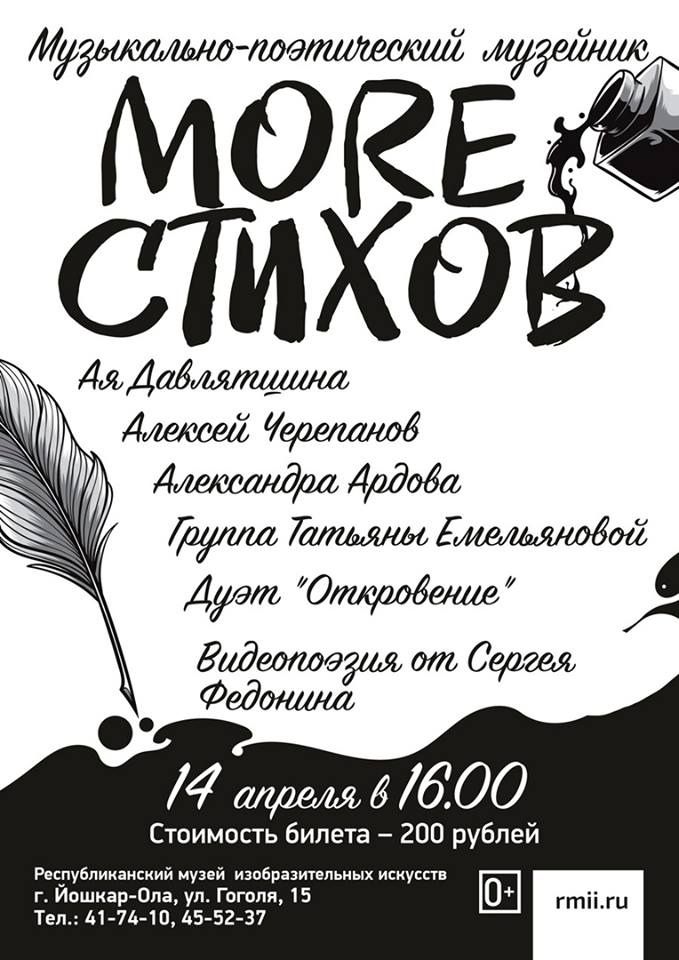 Всех, кто интересуется поэзией, современными направлениями медиа искусства, интересной и содержательной музыкой смогут получить море удовольствия на очередном, теперь уже Музыкально-поэтическом музейнике "MORE СТИХОВ".