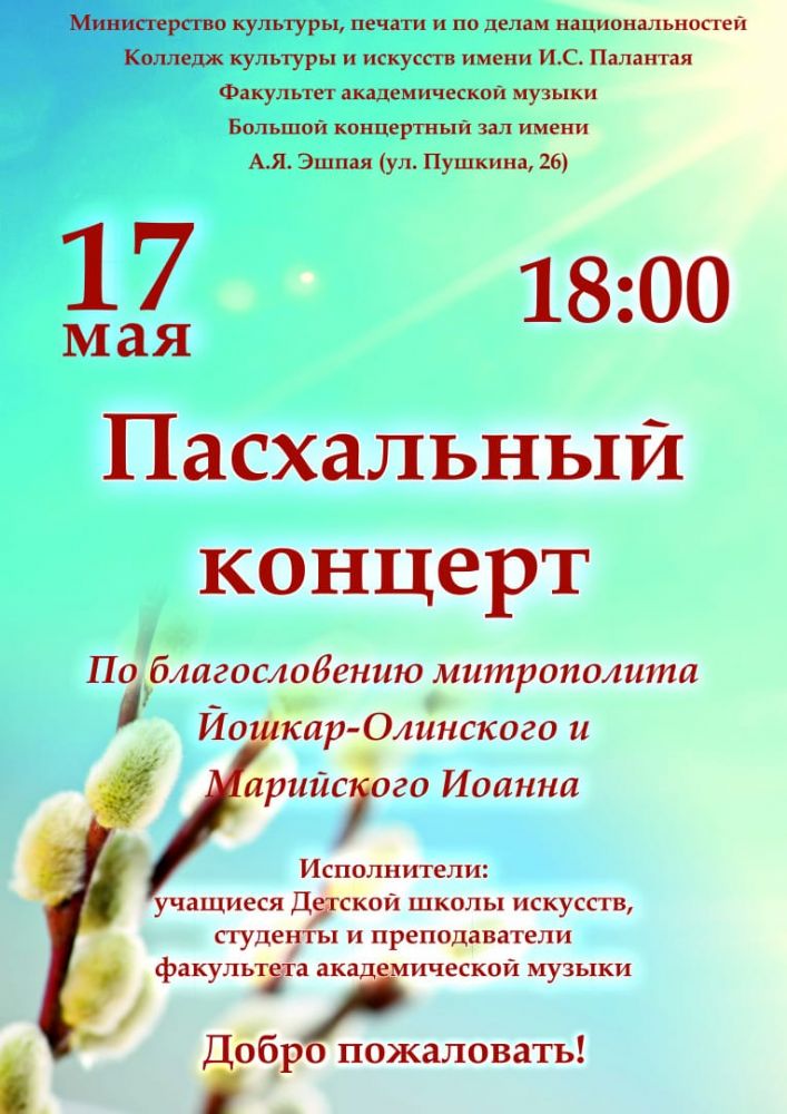 В понедельник 17 мая в марийской столице состоится концерт, посвященный празднику Светлой Пасхи.