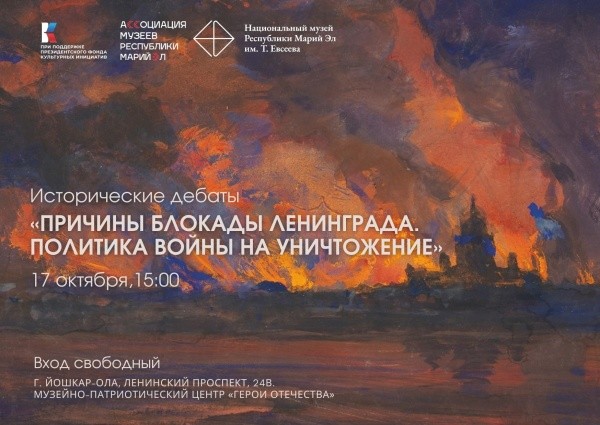 Сегодня, 17 октября, в Музейно-патриотическом центре Марий Эл состоятся исторические дебаты на важную тему «Причины блокады Ленинграда. Политика войны на уничтожение», сообщают в паблике Национального музея Республики Марий Эл имени Т. Евсеева.
