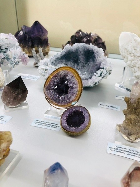 Пленниками этой «магии» в итоге стали и многие посетители выставки. Завораживали удивительные композиции и ассоциации минералов различных типов, классов, групп с разнообразной мировой географией. Драгоценных, таких как алмазы или изумруды, на выставке нет, но некоторые созданные природой композиции имеют немалую цену. Посетители удивятся, какие фантастические формы могут создавать кристаллы гипса, их поразят узоры малахита, причудливые образования стильбита, диоптаза, пирита и других. Лично меня привлекла агатовая миндалина с аметистовой жеодой (Китай) – одно из самых красивых образований в мире минералов. Снаружи обычно напоминает булыжник, но при разрезе увидишь настоящее сокровище: в замкнутой полости происходит нарастание минерального вещества от стенок к центру.Коллекционер, похоже, особо неравнодушен к кварцу, как и сама природа, которая творит из него даже «ювелирные изделия». Аметист, к примеру, не относится к драгоценным минералам, но по своей красоте эта разновидность кварца часто не уступает им. И, представьте, некоторые экземпляры кварца могут показаться «посланиями заточенных мастеров». К примеру, в коллекции есть маленький «гробик с крестиком» и сросток кристаллов в виде христианского креста...