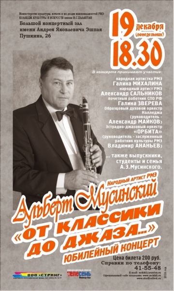 В юбилейном концерте «От классики до джаза…», кроме виновника торжества Альберта Мусинского, принимают участие знакомые всем любителям классики и джаза Марий Эл музыканты, в том числе эстрадно-джазовый оркестр «Орбита», а также образцовый духовой оркестр республиканского колледжа культуры и искусств, студенты, обучавшиеся у Альберта Эдуардовича, и члены его семьи, многие из которых также играют на музыкальных инструментах.