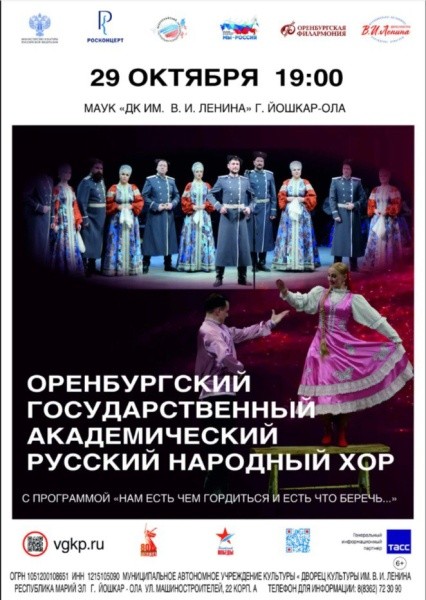 29 октября во Дворце культуры им. В.И.Ленина выступят артисты Оренбургского государственного академического русского народного хора. В программу «Нам есть чем гордиться и есть что беречь…» вошли золотой фонд песен, танцев и вокально-хореографических композиций.