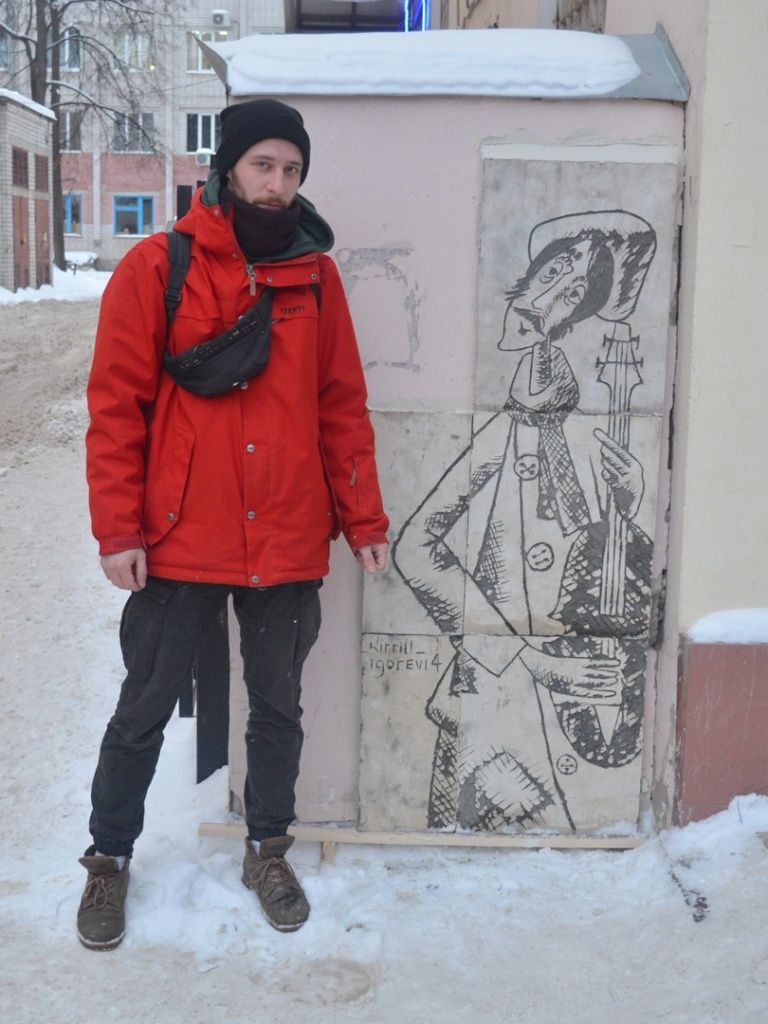 «Музыкант» должен был появиться давно, но сделать сграффито из 5 частей удалось только сейчас. И то, время специфическое: зимой клей для изображения держит слабо. Но работу планировалось делать для видео Кирилла, совпавшее со временем приезда его московского друга, которое должно было презентовать технику. Случайные кадры фотографа Сергея Бабикова сделали «музыканта» знаменитым раньше, чем задумывалось.