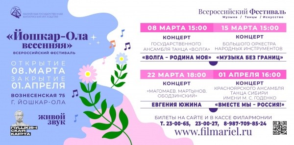 Всего в рамках фестиваля зрители увидят четыре концертные программы. Так, сегодня, 8 марта, перед йошкаролинцами выступит государственный ансамбль песни и танца "Волга" из Ульяновска. 15 марта марийскому зрителю представят концерт большого оркестра народных инструментов "Праздник души".