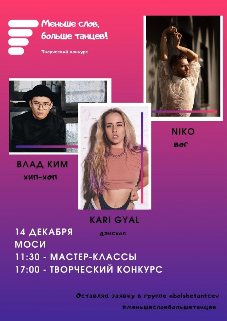 В рамках проекта "Меньше слов, больше танцев!", направленного на поддержку в сфере современного хореографического искусства молодых талантов, проживающих в Марий Эл, в Йошкар-Оле пройдут мастер-классы от Vlad Kim (участник 2 сезона шоу «Танцы» на ТНТ), Niko (участник 5 сезона шоу «Танцы» на ТНТ), Kari Gyal (организатор и участник танцевальных батлов).