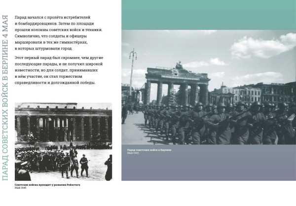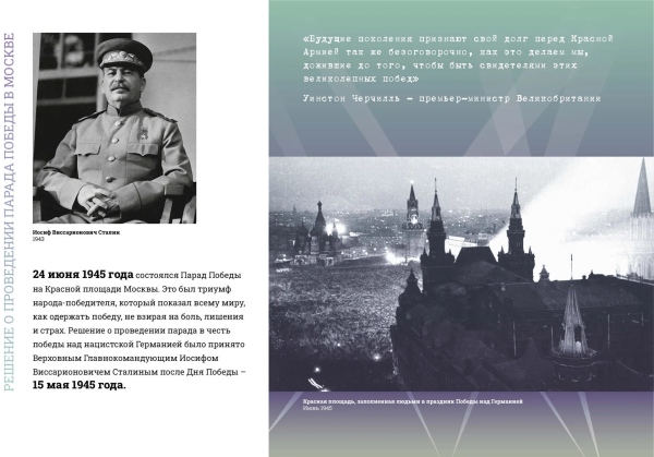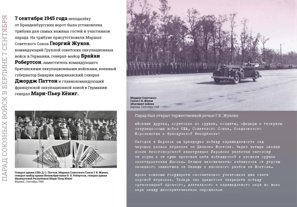 В Музее Победы отметили, что выставка посвящена четырем Парадам Победы 1945 года: 4 мая в Берлине, 24 июня на Красной площади, 7 сентября в Берлине и 16 сентября в Харбине.