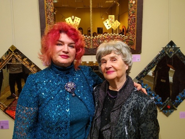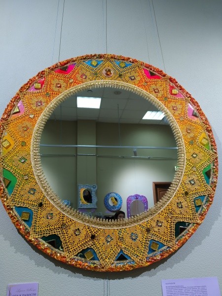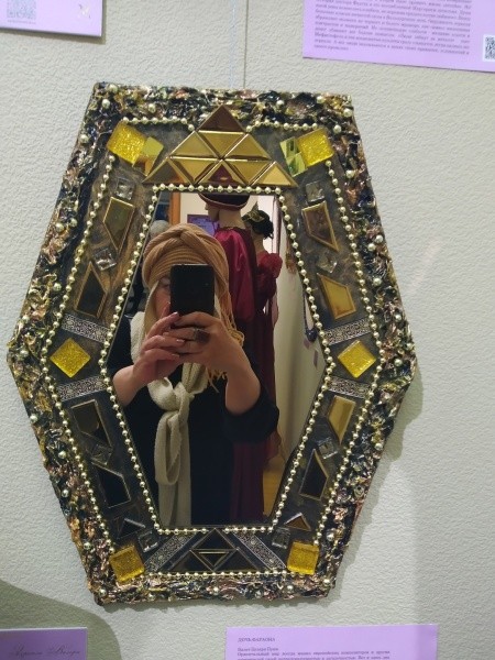 К этому восторгу можно добавить и возникшие долгосрочные планы сотрудничества с нашей республикой. Первое их воплощение – выставка «Театр зеркал», открывшаяся 27 марта. Подозреваю, что эта экспозиция вызовет раздражение у многих профессиональных художников, и в переводе на музыку они уже называют ее «художественной самодеятельностью». Дело в том, что у Бесединой огромный авторитет в театрально-музыкальном мире, она заслуженная артистка Российской Федерации, академик Петровской академии наук и искусств, член творческого Союза художников и Союза композиторов России, лауреат премии Правительства РФ в области культуры, многожанровый сочинитель – автор прекрасных опер, балета, ораторий, романсов. И вдруг в 2020 году стала «сочинять» зеркала-картины, то есть, на первый взгляд, осваивать декоративно-прикладное искусство. Уже в 2021 году в Москве прошла ее выставка с 39 работами, а направление ее творчества получило название «Зеркала Валери». Практически сразу не имеющего еще серий выставочных проектов и художественного образования автора приняли в члены творческого Союза художников России… Но не будем торопиться с выводами и сходим на выставку «Театр зеркал», в экспозиции которой 50 произведений.