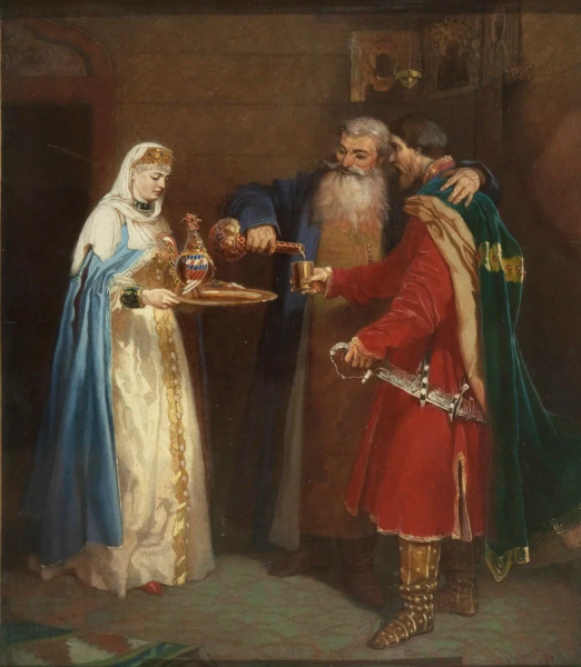 Если посмотреть на работу «Ожидание новобрачных от венца в Новгородской губернии» другого художника, Андрея Рябушкина, то можно увидеть, как мастер передал особое праздничное и одновременно волнительное состояние, в которое вовлекаются все участники важного события.