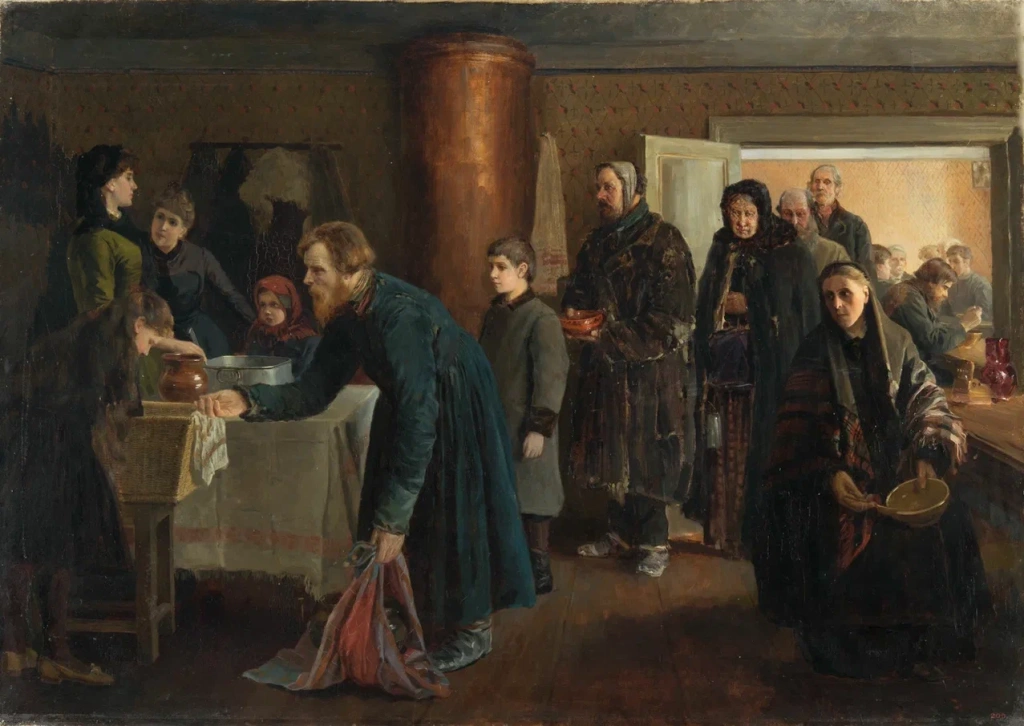 Так, к примеру, в произведении «Даровая столовая» Василия Навозова изображена сцена в бесплатной столовой для бедных – характерный сюжет жанровой живописи последней четверти XIX века. Художник подробно изображает людей, подчеркивая их социальный статус, детали интерьера и обстановки, проявляя особый интерес к проблемам фактуры и материальности предметов, рассказали в пресс-службе Государственного Русского музея.
